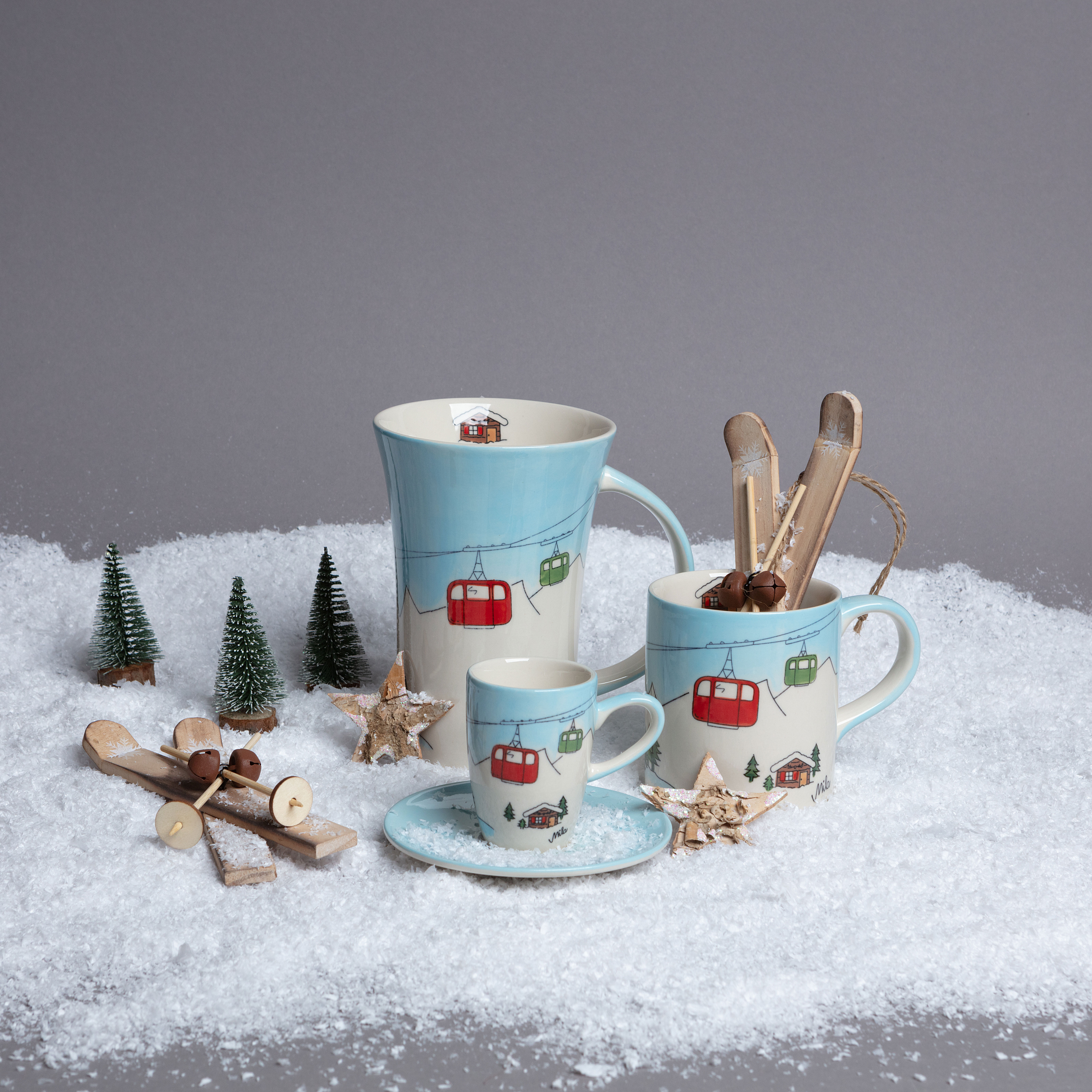 Linie bringt die frische, klare Bergluft direkt nach Hause. Die verschneiten Gipfel und die Gondel, die durch