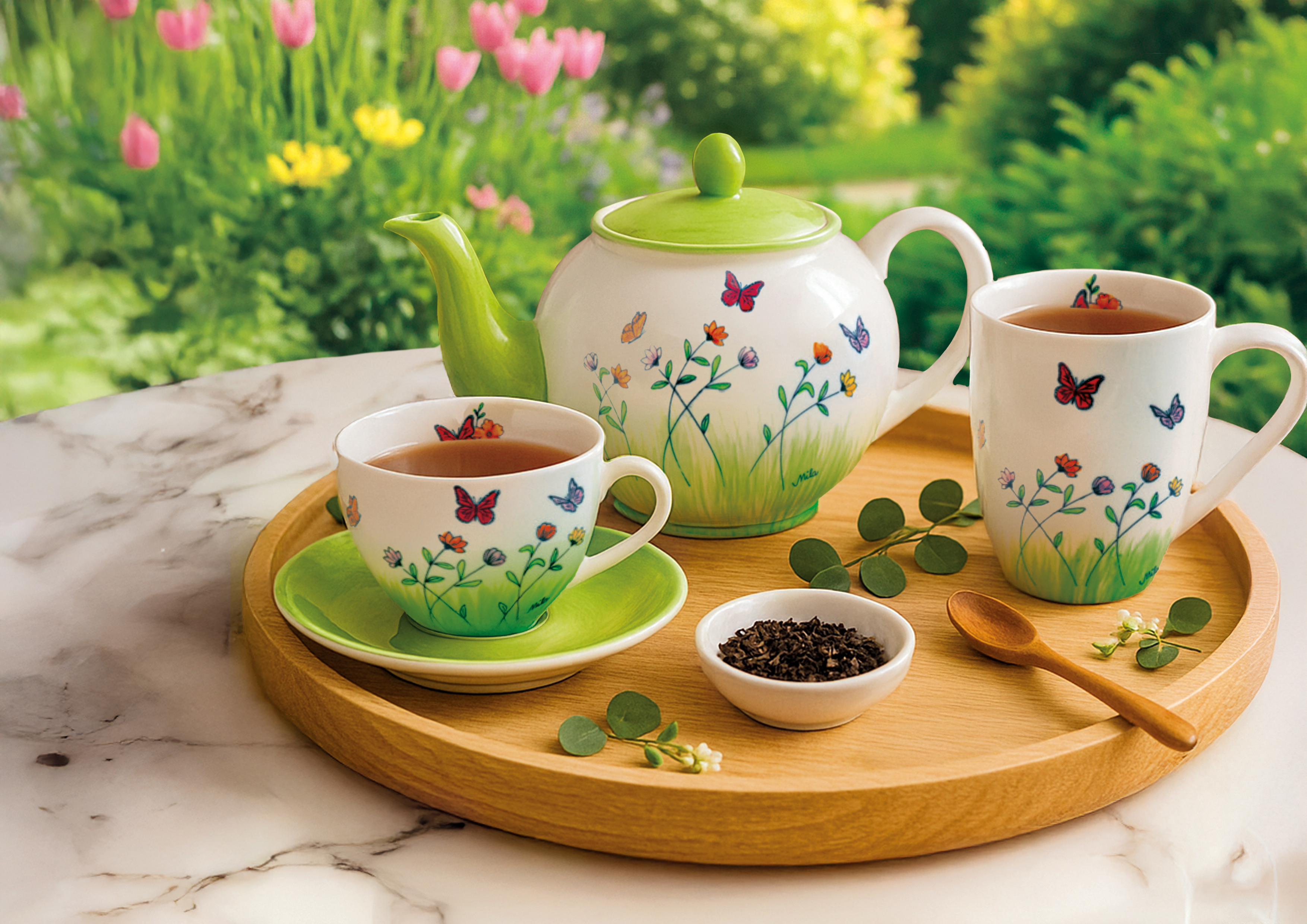 Frühlingserwachen auf dem Teller. Das Design fängt die Leichtigkeit und Farbenpracht blühender Wiesen ein. Zarte Wildblumen sprießen aus frischem, hellem Grün, während bunte Schmetterlinge fröhlich über die Blumen tanzen. Ein Design, das Lebensfreude versprüht und die Magie der Natur auf den Tisch holt. Ein Moment voller Leichtigkeit und bunter Glücksmomente – einfach aufblühen und genießen!