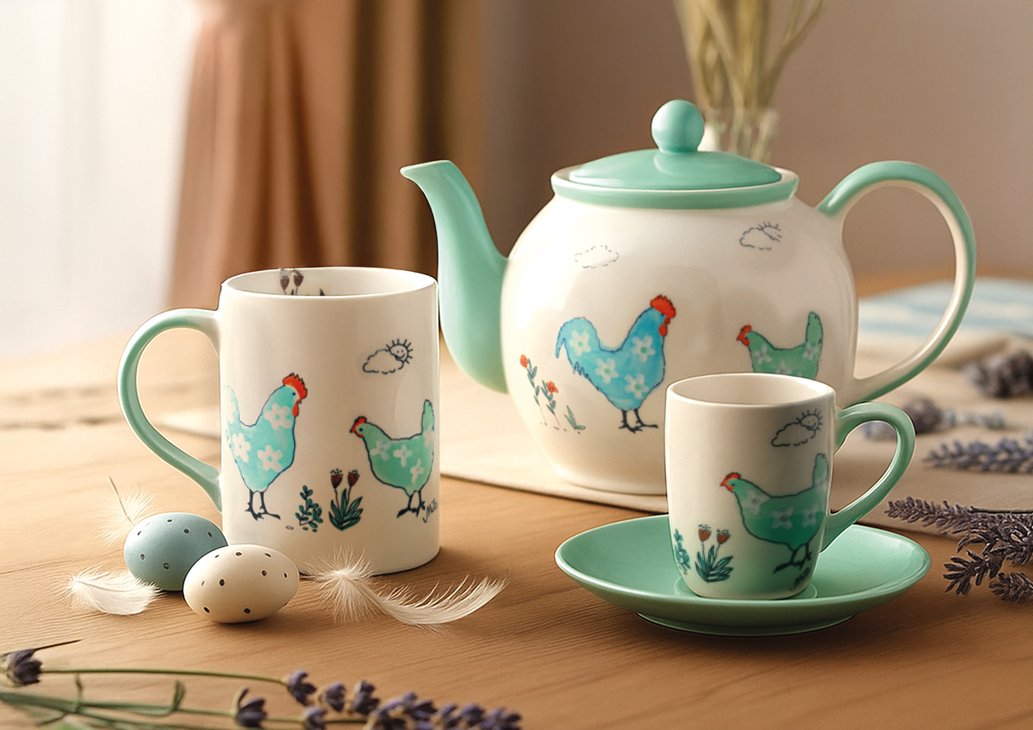 Frühlingsgefühle auf dem Tisch! Die fröhlichen Hühner spazieren munter über das Geschirr und bringen Freude und ein spielerisches Augenzwinkern in jede Mahlzeit. Ein Design, das das Herz tanzen lässt: heiter, verspielt und voller Frühlingszauber. Perfekt, um gemeinsam zu lachen und in guter Gesellschaft den Frühling willkommen zu heißen. Let’s brighten up the table!